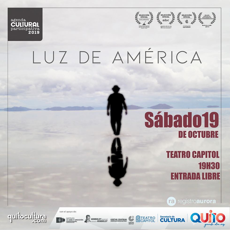 El documental ecuatoriano del director Diego Arteaga “Luz de América”, se presentará en Quito el sábado 19 de octubre en el teatro Capitol a las 19h30, como inicio de su recorrido por salas independientes, universidades y centros culturales de todo el país. El documental propone una reflexión sobre la luz y cómo esta influye en nuestro entendimiento del mundo y de nosotros mismo; nos lleva a un viaje visual de imágenes y símbolos de la luz a través de varias ciudades de América. Nos relata como nace la frase Quito Luz de América e investiga e interpreta visualmente varias teorías filosóficas relacionadas con la luz. El largometraje es ganador de los fondos del ICCA (Instituto de Cine y Creación Audiovisual del Ecuador) para Desarrollo de proyecto en el 2013 y para Producción en el 2015. Premiado como Mejor Proyecto Documental Latinoamericano en Bolivia LAB 2013, cuenta con el apoyo del Instituto Goethe (Asociación Humboldt) y el aval de la Academia de Historia del Ecuador. Luz de América fue estrenado en selección oficial en el Festival Internacional de documentales Encuentros del Otro Cine, EDOC en mayo 2018. Fue selección oficial en el Festival Internacional de Cine de la Alturas en Argentina 2018, estuvo en la Semana del cine ecuatoriano en París 2018 y fue parte de la selección oficial del Festival Kunturñawi 2018. Sinopsis: A partir de la luz que cae sobre el patio de su casa en el día del equinoccio sin sombra quiteño, e inspirado en la “Teoría de los colores” de Goethe, el director nos lleva a varias ciudades de América para reflexionar sobre la influencia que tiene la luz en el entendimiento de nuestro entorno. El fraile chileno Camilo Henríquez bautizó a la ciudad de Quito como “Luz de América” luego de la masacre de los héroes independentistas de 1810. Este hecho desencadena en el filme una búsqueda poética en torno al símbolo de la luz como antorcha de libertad, fuente de conocimiento y metáfora del amor, “la palabra que hace vibrar el Universo”. Ficha Técnica Género: Largometraje documental Duración: 70 minutos Formato: Video HD color Dirección: Diego Arteaga Edición: Diego Arteaga Producción: Paula Parrini (Registro Aurora, Caleidoscopio Cine) Fotografía: Diego Arteaga, Martín Jaramillo Serrano, Lucía Romero, Tomás Astudillo y Guillermo González Stambuk Diseño de Sonido: Andrés Galarza Mier Música: Inti-illimani, Estupendo, Juan Mullo, MUNN, Gora Malatesta, Lascivio Bohemia, Eduardo Zurita, Andrea Almeida, Ludwig Van Beethoven. Contacto Paula Parrini 593 998 508 267 registroaurora@gmail.com www.registroaurora.webnode.ec Link Tráiler: https://vimeo.com/367105346 Link al Promocional; https://vimeo.com/367127599 https://www.facebook.com/Luz-de-Am%C3%A9rica-331569793685089/?ref=bookmarks